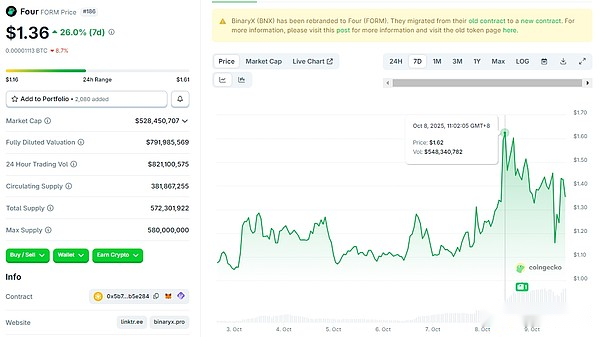 Four.Meme’s native token FORM hit a 7-day high of $1.62 on October 8. As of press time, FORM was trading at $1.36, a 26% increase on the 7th.