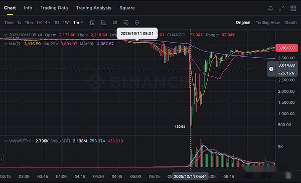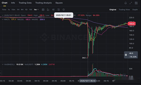 As of 5:19, there was still liquidity on the orderbook (the trading volume was also very high), but at 5:20, the orderbook basically fell into a vacuum, hitting 0.001.