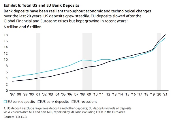 Les dépôts bancaires ont fait preuve de résilience face aux changements économiques et technologiques des 20 dernières années.Les dépôts américains continuent de croître ;Les dépôts de l’UE ont ralenti après la crise financière mondiale et la crise de la zone euro, mais ont néanmoins maintenu une tendance à la croissance ces dernières années. Le graphique ci-dessous montre le total des dépôts bancaires aux États-Unis et dans l’Union européenne.