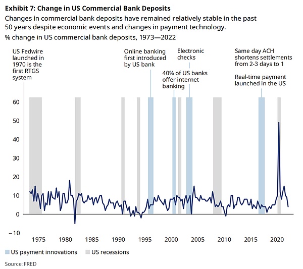 Les jetons de dépôt en sont encore à leurs premiers stades de développement, il n’existe donc pas suffisamment de données démontrant leurs caractéristiques comportementales.Cependant, ils sont conçus pour être une extension des dépôts traditionnels sur la blockchain, car les jetons eux-mêmes représentent une créance sur le dépôt contre la banque émettrice.L’analyse des données historiques montre que malgré l’environnement de taux d’intérêt faibles, voire négatifs, et des innovations telles que le règlement intégral en temps réel et les paiements rapides qui ont accéléré les délais de paiement, les dépôts traditionnels sont restés une source de fonds stable et fiable pour les banques commerciales tout au long du cycle économique.