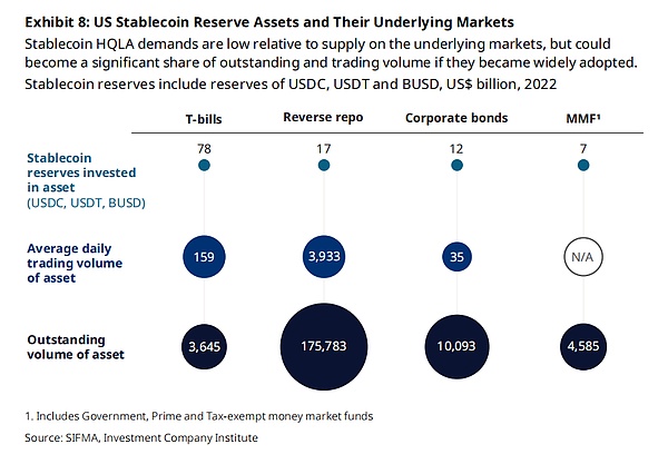 En raison de la composition différente des actifs de réserve, les pièces stables non bancaires peuvent avoir un impact différent sur les intermédiaires de crédit que les jetons de dépôt.Actuellement, la plus grande réserve de stablecoin est principalement configurée avec des instruments en espèces et des bons du gouvernement à très court terme.Même si cela réduit le risque de rachats massifs, cela peut entraîner une désintermédiation du crédit.Si une grande quantité de dépôts afflue vers ces pièces stables, les fonds passeront des investissements privés et des consommateurs à l’achat uniquement d’obligations d’État à court terme, ce qui aura un impact neutre ou négatif sur les investissements gouvernementaux et privés à long terme et pourrait faire augmenter les coûts d’emprunt à long terme.