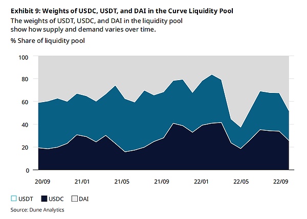 Les Stablecoins sont confrontés à des problèmes de durabilité similaires. Sa performance de marché reflète son risque de crédit ainsi que la dynamique de l’offre et de la demande.Par exemple, dans le protocole Curve sur Ethereum, un protocole d’échange de pièces stables populaire, un certain pool de liquidités contient des quantités variables d’USDC, d’USDT et de DAI.La pondération inégale de ces pièces stables dans le pool reflète les différences entre l’offre et la demande, qui sont motivées par divers facteurs, notamment la popularité de chaque pièce stable parmi les autres protocoles DeFi, la perception du marché quant à son risque, etc.Par exemple, lorsque les utilisateurs échangent un certain stablecoin contre un autre stablecoin qu’ils considèrent comme plus sûr, la proportion du premier dans le pool augmentera.Néanmoins, de grands pools de liquidités comme Curve permettent aux utilisateurs d’échanger facilement entre des pièces stables, permettant ainsi la fongibilité entre les pièces stables via les taux de change du marché.Par exemple, en octobre 2022, l’actif total de ce pool de courbe USDC/USDT/DAI dépassait 760 millions de dollars, avec un volume de transactions quotidien de 60 millions de dollars.