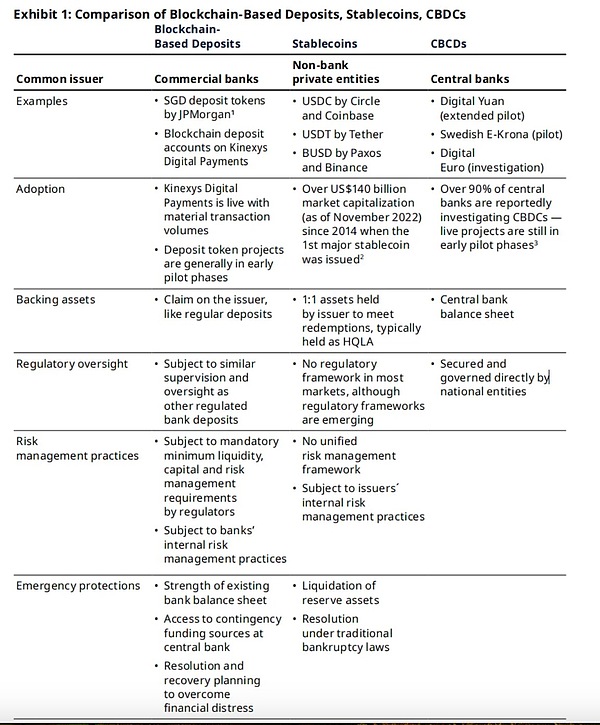 Cependant, il est prévisible qu’à mesure que la technologie blockchain est de plus en plus utilisée dans des activités de transactions commerciales complexes (y compris les activités au niveau institutionnel), les gens commencent à s’intéresser à un problème :Afin de continuer à prendre en charge les paiements blockchain à grande échelle, quelle forme de monnaie numérique est nécessaire ?Dans ce contexte, les jetons de dépôt et les monnaies numériques des banques centrales (CBDC) sont devenus au centre des discussions sur la forme optimale des futures monnaies numériques.