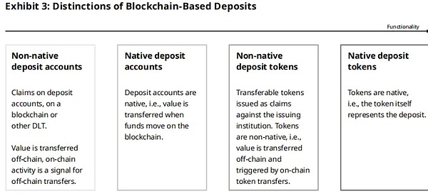 Les dépôts blockchain basés sur des comptes font référence aux dépôts détenus par des institutions de dépôt traditionnelles, qui sont enregistrés dans le système de grand livre basé sur la blockchain sous la forme de soldes de comptes. L’établissement de dépôt assume la responsabilité du solde du compte envers le titulaire du compte ; tandis que les dépôts blockchain basés sur des jetons sont des jetons transférables émis par l’institution de dépôt sur la blockchain, représentant des créances sur le montant spécifique des dépôts de l’institution.L’institution émettrice est responsable du remboursement du montant en monnaie légale correspondant au détenteur du token.