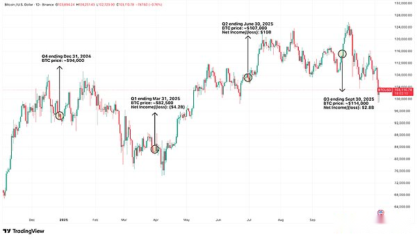 La société a subi des pertes lorsque le prix du Bitcoin est tombé en dessous de 85 000 dollars en mars ; il a ensuite réalisé des bénéfices aux deuxième et troisième trimestres, le Bitcoin clôturant au-dessus de 107 000 $ et 114 000 $ le 30 juin et le 30 septembre, respectivement.Aujourd’hui, la société fonctionne en parfaite synchronisation avec le cycle des prix du Bitcoin, achetant constamment mais ne vendant jamais.
