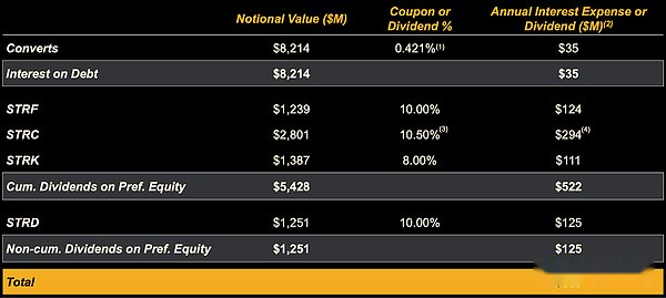 Dans l’ensemble, le coût de la dette convertible et des capitaux propres obligerait Strategy à payer environ 689 millions de dollars d’intérêts et de dividendes par an.