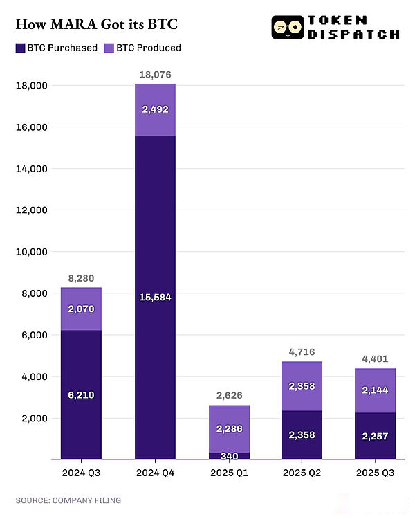Contrairement à Strategy, Marathon acquiert Bitcoin par deux méthodes : le minage et les achats sur le marché libre.Au troisième trimestre 2025, Marathon a extrait 2 144 Bitcoins et acheté 2 257 Bitcoins sur le marché.