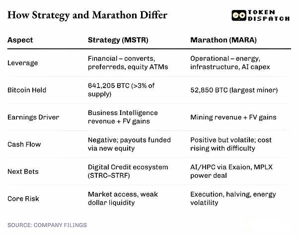 Strategy prétend fièrement être la plus grande société de trésorerie Bitcoin au monde, tandis que Marathon Digital (MRAR) a clairement indiqué dans sa lettre trimestrielle aux actionnaires se terminant le 30 septembre 2025 que « nous ne sommes pas une société de trésorerie Bitcoin ».Ceci malgré le fait que la société exploite la plus grande ferme minière publique de Bitcoin au monde et détient plus de Bitcoins que tout autre mineur.