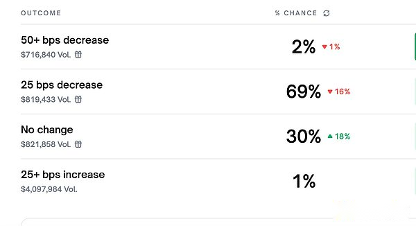 Early this morning, the Federal Reserve announced its October interest rate decision.Lower the benchmark interest rate by 25 basis points to 3.75%-4.00%, cutting interest rates for the second consecutive meeting, in line with market expectations.It is also the fifth interest rate cut since September 2024.However, the subsequent FOMC statement and a series of remarks from Powell’s press conference lowered expectations of whether the Fed can continue to cut interest rates in December, triggering market concerns.According to the latest CME “Fed Watch”,The probability of the Fed cutting interest rates by 25 basis points in December is 67.8%,The probability of keeping interest rates unchanged is 32.2%.The probability that the Fed will cut interest rates by 25 basis points cumulatively by January next year is 56%, the probability of keeping interest rates unchanged is 21.5%, and the probability of cumulative interest rate cuts by 50 basis points is 22.5%.Prediction market Polymarket data shows that the market is betting on the Federal Reserve’s December interest rate decision.Before the announcement of this resolution, the market was betting that the probability of a further 25 basis point interest rate cut in December was 90%. After the announcement of the resolution, the probability has dropped to 69%.The market is betting that the probability of suspending interest rate cuts in December has risen to 30%.