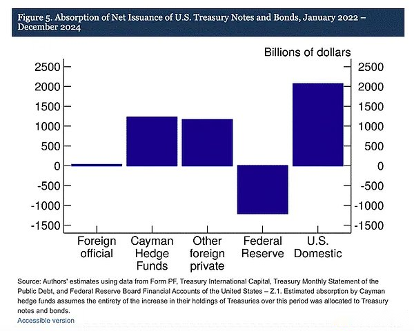 “Our findings suggest that Cayman Islands hedge funds are increasingly becoming marginal foreign buyers of U.S. Treasury notes and bonds. As shown in Figure 5, between January 2022 and December 2024, when the Fed is reducing the size of its balance sheet through a rollover of Treasury maturities,Cayman Islands hedge funds bought net $1.2 trillion in Treasuries.Assuming these purchases were comprised entirely of Treasury notes and bonds, they absorbed 37% of net issuance of notes and bonds, nearly as much as all other foreign investors combined.”