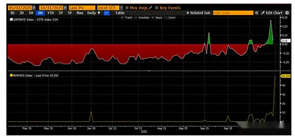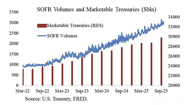 SOFR is a composite index based on various types of repo transaction rates.Unlike LIBOR, which is based on bank quotes, SOFR is based on actual market transactions.This is the Fed’s target interest rate.If SOFR trades above the federal funds rate ceiling, it means cash is tight, this is a problem.Because once cash is tight, SOFR will soar and the dirty fiat financial system will stagnate.This is because both marginal buyers and suppliers of liquidity use leverage.If they are unable to reliably roll over their liabilities at the federal funds rate, they will first suffer huge losses and then stop providing liquidity to the system.The concern is that without access to cheap leverage, no one will participate in the Treasury market.(Note: SOFR soared to 4.22% last Friday, October 31, and the Federal Reserve cut interest rates again last week, so SOFR should remain around 4.00%)