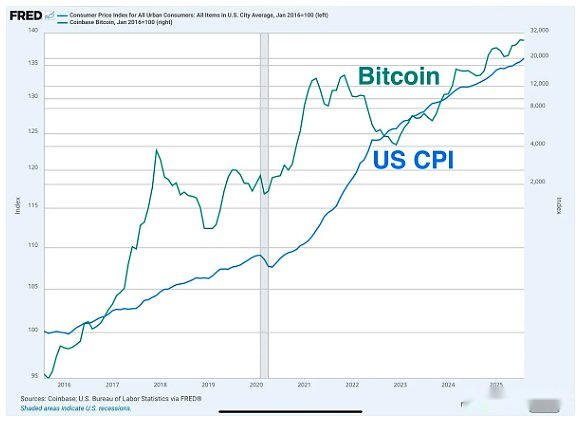 Aunque Bitcoin ha estado rastreando las tendencias del IPC hasta 2023, los datos en los gráficos parecen que hay mucho ruido. peroDesde alrededor de 2023, Bitcoin y CPI han estado estrechamente vinculados.Esta estrecha correlación sugiere que los inversores están utilizando Bitcoin como un activo de cobertura de inflación.