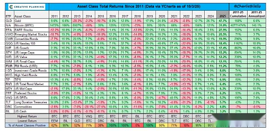 Charlie Bilello de Creative Planning enfatizó que «el oro (+48%) y Bitcoin (+31%) son los activos principales de mejor rendimiento hasta ahora en 2025. Nunca hemos visto ambos activos clasificados primero y segundo en ningún año».