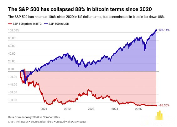 El S&P denominado en dólares estadounidenses ha aumentado más del 100% desde 2020. Esto es genial, ¿verdad?Pero no te preocupes.Precios de activos monetarios limitados y robustos como Bitcoin, el mismo índice cayó casi 90% en el mismo período de tiempo.