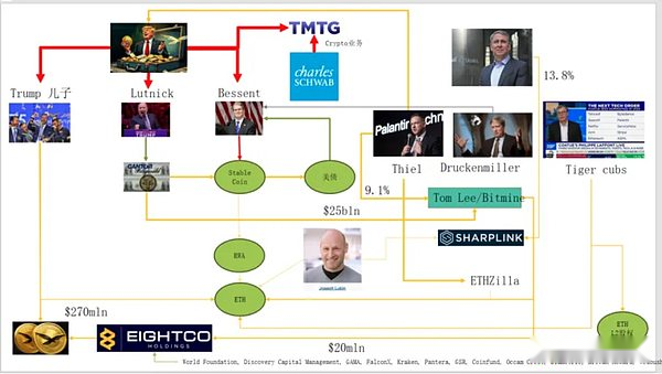 من هذه الصورة، يمكنك أن ترى أن عائلة ترامب، وصناع سوق السندات التقليديين، ووزارة المالية، وشركات التكنولوجيا، وشركات التشفير مرتبطة بشكل معقد، حيث أصبح الاتصال البيضاوي الأخضر هو العمود الفقري: