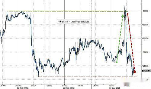 ビットコインは水曜日に一時9万ドルまで急騰したが、トレーダーらは空売りポジションの大量清算が原因とみていたが、すぐに下落を再開した。元の仮想通貨は10月の暴落以来取引範囲の下限に戻り、最大2.8%下落して8万5278ドルとなった。