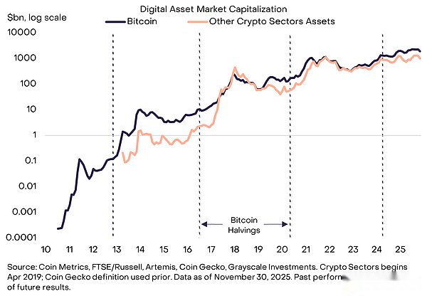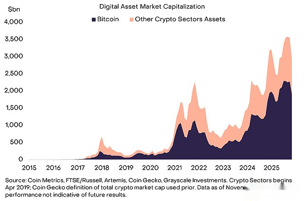 グレイスケール氏は、暗号資産クラスは現在進行中の強気相場の真っただ中にあり、2026年が4年サイクルの終わりを迎えると考えている。私たちは、2026 年には 6 つの主要な暗号通貨セクターすべての評価額が上昇すると予想しています。ビットコイン価格は2026年上半期に過去の高値を超える可能性があると考えています。スパン>