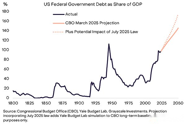 米国経済は債務問題に直面しており(図表3を参照)、最終的には価値の保存手段としてのドルの地位を損なう可能性がある。他の国も同様の問題に直面しているが、今日では米ドルが世界の支配的な国際通貨であるため、潜在的な資本の流れにとって米国の政策の信頼性の方が重要である。私たちは、デジタル資産の小さなサブセットは、十分に遍在し、分散されており、供給の増加が限られているため、実行可能な価値の保存場所であると考えることができると考えています。これには、時価総額で最大の 2 つの暗号資産、ビットコインとイーサリアムが含まれます。物理的な金と同様に、その有用性は部分的にはその希少性と自律性に由来します。