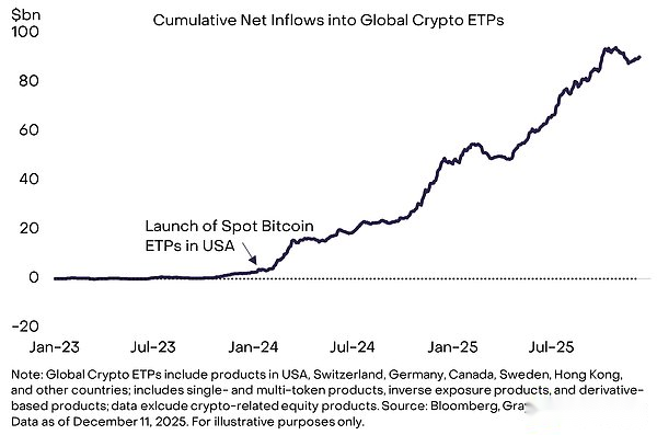 他の資産クラスと同様に、仮想通貨の価格変動はファンダメンタルズと資本フローの組み合わせによって決まります。商品市場には周期性があり、仮想通貨も将来の特定の期間に周期的な下落を経験する可能性があります。しかし、これが 2026 年に起こるとは考えていません。ファンダメンタルズは引き続き堅調です。当社は、代替価値保存手段に対するマクロ経済的需要が持続し、規制環境の透明性が機関投資家によるパブリック ブロックチェーン テクノロジーへの投資を促進すると予想しています。さらに、市場には依然として新たな資金が流入しており、来年末までにさらに多くの投資ポートフォリオに仮想通貨ETPが登場する可能性が高い。このサイクルでは大規模な個人需要はありませんでしたが、さまざまな投資ポートフォリオから仮想通貨ETPの購入が継続しました。マクロ経済環境は全般的に後押し的であり、これらの状況が2026年に仮想通貨資産クラスを新たな高値に押し上げるだろうと私たちは考えています。スパン>