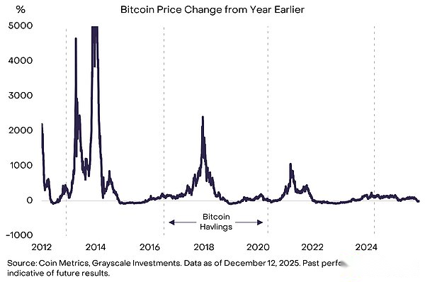 仮想通貨の誕生から現在に至るまで、その評価額は平均して 4 年に 1 回、周期的に 4 回大きな下落を経験しています(図 2 を参照)。周期的な評価額のピークのうち 3 回は、ビットコインの半減期イベントの 1 ~ 1.5 年後に発生し、これも 4 年ごとに発生します。現在の強気相場は3年以上続いており、直近のビットコイン半減期は1年半以上前の2024年4月に発生した。その結果、一部の市場参加者の間では、ビットコイン価格は10月にピークに達した可能性があり、2026年は仮想通貨のリターンにとって厳しい年になるだろうとの見方が広まっている。