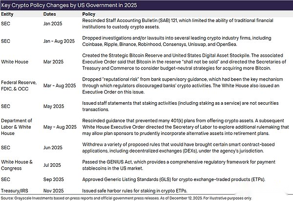 船はゆっくりと旋回していました。 2023年、グレイスケールは米国証券取引委員会(SEC)に対する訴訟で勝訴し、スポット仮想通貨ETPへの道を切り開いた。 2024年にはビットコインとイーサリアムのスポットETPが上場される予定だ。 2025 年に議会はステーブルコインに関する GENIUS 法を可決し、規制当局は仮想通貨に対するスタンスを転換し、消費者保護と金融の安定に引き続き重点を置きながら業界と協力して明確なガイダンスを提供しました。グレイスケール氏は、議会が2026年に超党派の仮想通貨市場構造法案を可決すると予想しており、これにより米国の資本市場におけるブロックチェーンベースの金融の地位が強化され、機関による継続的な投資が促進される可能性が高い(図4を参照)。