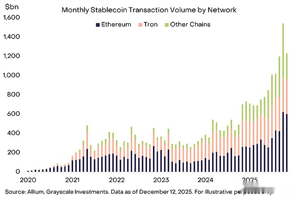 ステーブルコインは 2025 年に爆発的な成長をもたらすでしょう。流通供給量は 3,000 億米ドルに達し、11 月までの 6 か月間で月平均取引量は 1 兆 1,000 億米ドルに達しました。米国議会はGENIUS法を可決し、多額の機関資本が業界に注ぎ込まれました(図表10)。私たちは、2026 年に具体的な結果が得られると期待しています。ステーブルコインは、国境を越えた決済サービスに統合され、デリバティブ取引所の担保として機能し、企業の貸借対照表に掲載され、消費者のオンライン決済におけるクレジット カードの代替手段となります。予測市場の継続的な成長も、ステーブルコインに対する新たな需要を促進する可能性があります。ステーブルコインのトランザクション量が増加すると、これらのトランザクションを記録するブロックチェーン (ETH、TRX、BNB、SOL など) だけでなく、さまざまなサポート インフラストラクチャ (LINK など) や分散型金融 (DeFi) アプリケーション (トピック #7 を参照) にも利益がもたらされます。