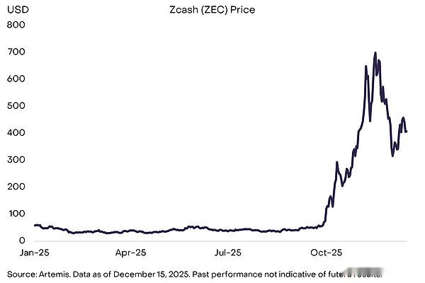 プライバシーは金融システムの本質的な部分です。ほぼすべての人が、自分の給与、税金、純資産、支出習慣が公開台帳上で非公開であることを期待しています。ただし、ほとんどのブロックチェーンはデフォルトで透過的です。パブリック ブロックチェーンを金融システムにさらに深く統合するには、より強力なプライバシー インフラストラクチャが必要になります。このことは、規制がこの統合を推進するにつれてますます明らかになってきています。投資家がプライバシーを重視することは、プライバシー機能を備えたビットコインに似た分散型デジタル通貨である Zcash (ZEC) などのプロジェクトに利益をもたらす可能性があります。 Zcash は 2025 年の第 4 四半期に大幅に値上がりするでしょう (図 12 を参照)。他の主要なプロジェクトには、プライバシーに重点を置いたイーサリアム レイヤ 2 プロトコルである Aztec や、DeFi 用のプライバシー ミドルウェアである Railgun などがあります。また、Ethereum (ERC-7984 プロトコルを採用) や Solana (Confidential Transfers トークン拡張を採用) などの主要なスマート コントラクト プラットフォームで機密トランザクションの採用が増加する可能性もあります。より優れたプライバシー ツールには、DeFi のより強力なアイデンティティとコンプライアンス インフラストラクチャも必要になる場合があります。