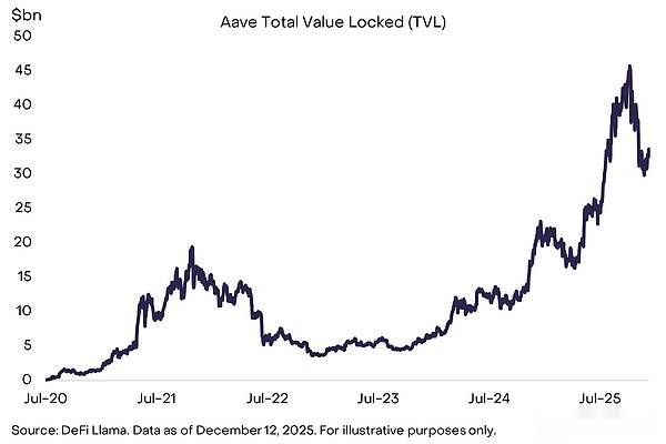 2025 年には、技術の進歩と有利な規制要因によって、DeFi アプリケーションが強力に発展するでしょう。ステーブルコインとトークン化された資産の成長は重要な成功事例であり、DeFi 融資も大幅な成長を遂げており、Aave、Morpho、Maple Finance などのプラットフォームが際立っています (図 14 を参照)。一方、ハイパーリキッドのような分散型永久先物取引所は、建玉と日々の取引量で成長を続けており、最大手の集中型デリバティブ取引所のいくつかに匹敵する。今後、これらのプラットフォームの流動性、相互運用性、現実世界の価格との相関性の向上により、オンチェーンで金融取引を直接実行したいユーザーにとって、DeFiは信頼できる選択肢となるでしょう。将来的には、より多くのDeFiプロトコルが従来のフィンテック企業と統合され、そのインフラストラクチャと大規模なユーザーベースを活用することが予想されます。私たちは、AAVE などの融資プラットフォーム、UNI や HYPE などの分散型取引所、LINK などの関連インフラストラクチャ、およびほとんどの DeFi アクティビティ (ETH、SOL、BASE など) をサポートするブロックチェーンを含む、コア DeFi プロトコルがこの恩恵を受けることを期待しています。