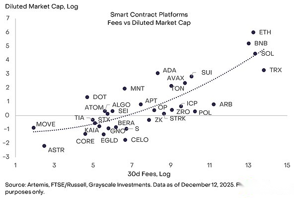 ブロックチェーンはビジネスではありませんが、ユーザー、取引量、手数料、ロックされた資本/総価値 (TVL)、開発者、アプリケーションなどの測定可能なファンダメンタルズを持っています。これらの指標の中で、Grayscale は取引手数料が最も価値のある基本指標であると考えています。なぜなら、取引手数料は操作が最も難しく、異なるブロックチェーン間で最も比較できるからです (経験的に最も適合するものでもあります)。取引手数料は、従来のビジネスファイナンスにおける「収益」に似ています。ブロックチェーン アプリケーションの場合、プロトコル料金/収益と「供給側」料金/収益を区別することも重要な場合があります。機関投資家が仮想通貨分野に資金を配分し始めるにつれ、手数料収入が高い、あるいは増加しているブロックチェーンやアプリケーション(ビットコイン以外)に注目すると予想されます。比較的収益の高いスマート コントラクト プラットフォームには、TRX、SOL、ETH、BNB などがあります (図 16)。比較的収益の高いアプリケーション層資産には、HYPE と PUMP が含まれます。