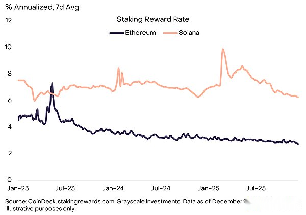 米国の政策立案者は、2025 年にステーキング関連政策に 2 つの調整を加え、より多くのトークン保有者が参加できるようにしました。(i) 米国証券取引委員会 (SEC) は、流動性ステーキング活動は証券取引に該当しないことを明確にしました。 (ii) 米国内国歳入庁 (IRS) と財務省は、投資信託/上場商品 (ETP) はデジタル資産を担保にできると述べました。流動性ステーキング サービスに関するこれらのガイダンスは、イーサリアムとソラナ上の主要な TVL ベースの流動性ステーキング プロトコルである Lido と Jito に利益をもたらす可能性があります。より広く言えば、暗号ETPがステーキングできるという事実は、それがプルーフ・オブ・ステーク(PoS)トークンの投資ポジションを保持するためのデフォルトの構造となり、より高いステーキング比率とより高い報酬率につながる可能性があります(図17)。ステーキングがより広く採用される環境では、ETPを介したカストディアルステーキングは報酬を獲得する便利な方法を提供しますが、オンチェーンのノンカストディアル流動性ステーキングにはDeFiで構成できるという利点があります。この二重構造はしばらく続くと予想されます。