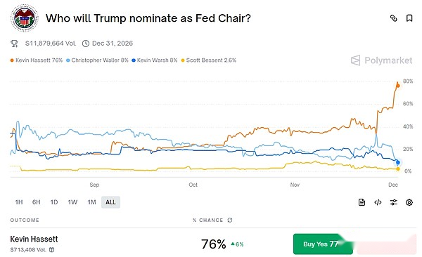 ホワイトハウス国家経済会議のハセット委員長は11月30日、トランプ大統領が自身を連邦準備理事会(FRB)議長に指名すれば「喜んで議長を務めるだろう」と述べた。ポリマーケットのデータによると、ハセット氏が連邦準備制度理事会議長に選出される確率は76%に上昇した。