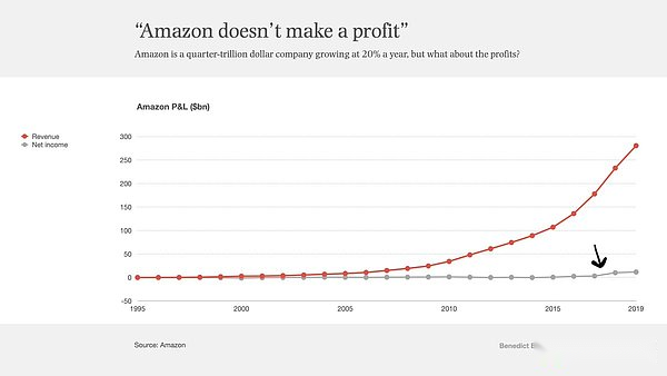 これは 1995 年から 2019 年までの 24 年間にわたる Amazon の損益計算書です。赤い線は収益を表し、灰色の線は利益を表します。最後にわずかに盛り上がっている灰色の線の小さな部分が見えますか?アマゾンが本格的に利益を上げ始めたのは22年目だった。