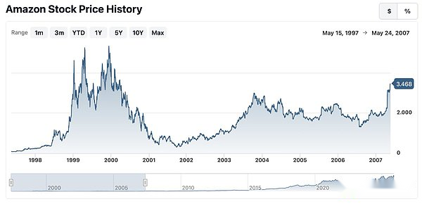 そしてイーサリアムはちょうど10周年を迎えました。最初の10年間のAmazon株のパフォーマンスは次のとおりです。