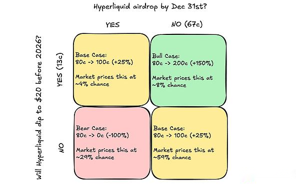 まだ遅れている生徒たちに例を示してください。先月、Polymarket で次のようなポジションを構築できました。「ハイパーリキッドは 12 月 31 日までにエアドロップしない」というポジションを 67 セントの価格で購入し、「ハイパーリキッドは 2026 年までに 20 ドルに下落する」というポジションを 13 セントの価格で購入します。ここで、結果として得られる行列を考えてみましょう。