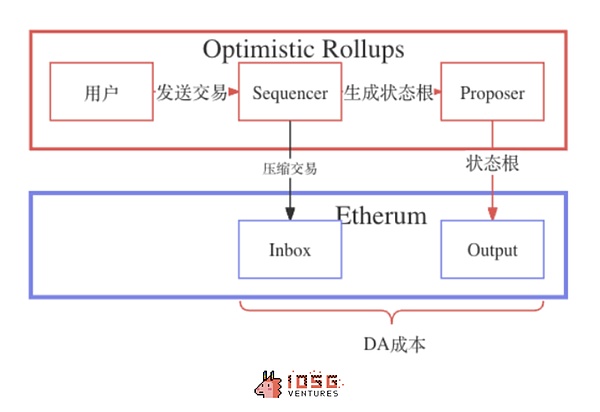 Optimistic Rollup的成本結構相對簡單,在沒有驗證成本的情況下,用戶僅需要支付L2的計算成本和發布到L1數據的DA成本,其中狀態根的發布由於和出塊相關,更偏固定成本,而壓縮交易的上傳為易於預估易於分攤的可變成本。