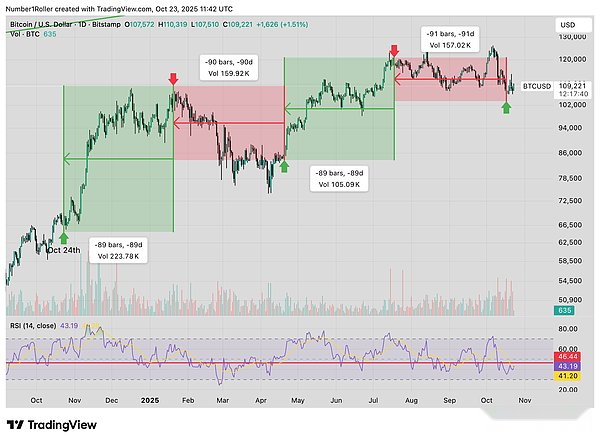 10 月 17 日の安値から 90 日間遡って推定すると、市場は昨年の 10 月 24 日の安値まで遡り、90 度ごとに高値と安値を形成していることがわかります。