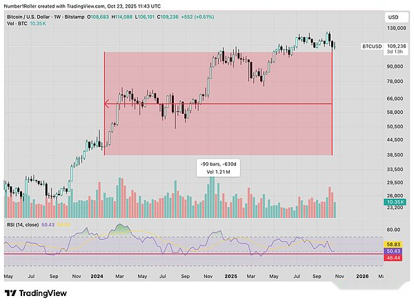 2024年1月の上場投資信託(ETF)設定後の週間安値は、2025年10月17日からちょうど90週目に発生した。