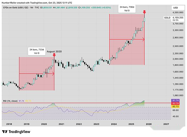 以下では、2020 年の金価格の上昇と比較して、時間枠の変化がどの程度似ているかを確認できます。最低値から最高値まではちょうど 24 か月です。私はここでゴールドトップや予測を分析しているのではなく、これらの動きは下から上までまったく同じ時間枠であることを指摘しているだけです。