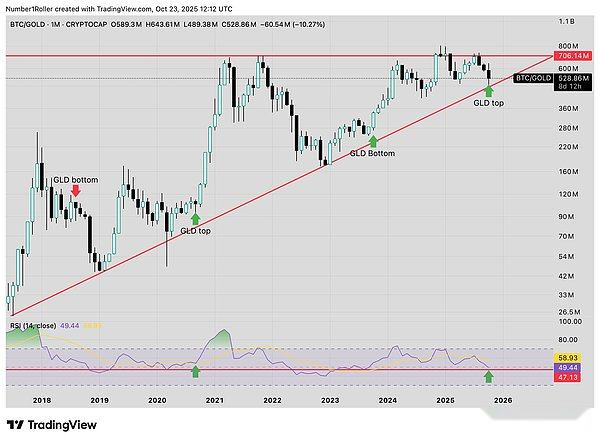 これらのポイントをビットコイン対ゴールドのチャートに当てはめると、結果は次のようになります。
