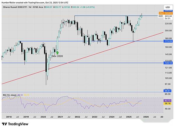 現在のマクロ情勢に関して、最後にお話したいのは IWM です。周知のとおり、IWM (ラッセル 2000 ETF) は投機活動の高まりを示すシグナルです。最後に月間チャートで明確なブレイクアウトを見せたのは5年前だった。今日は明確なブレイクアウトと終値を確認していませんが、時間が目安となるのであれば、11月には強く終値を迎えるはずです。