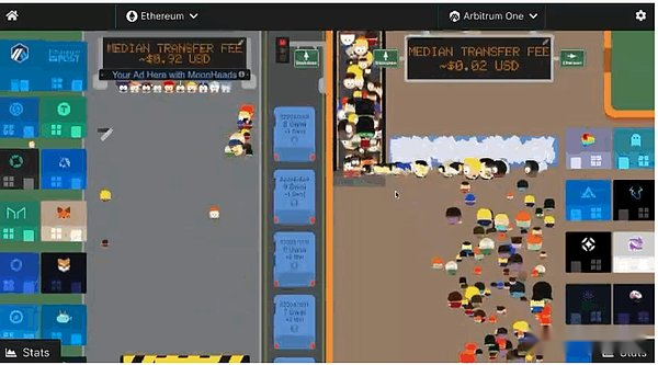 在這裡,我們看到的是兩個區塊鏈的表示:左側是以太坊,右側是 Arbitrum(Dencun 更新的網絡),每個人代表一筆交易。