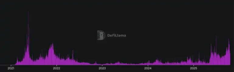 這種市場情緒並非個案,Defillama 鏈上數據顯示,10 月 8 日 Bsc 鏈的交易量猛增至 60.5 億美元,一度達到了 2021 年 BSC 上一輪機制幣山寨行情的盛況,只不過這一次是由中文 Meme 帶領的。