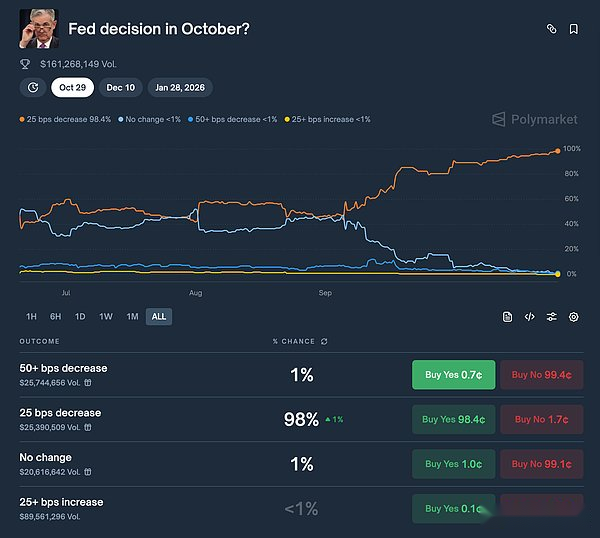 すべての投資家はこの日が来ることを知っています。一年中カレンダーに載っています。ほとんどの投資家はFRBが利下げすると予想している。実際、ポリマーケットは現在、25ベーシスポイントの利下げの確率が98%であると示している。