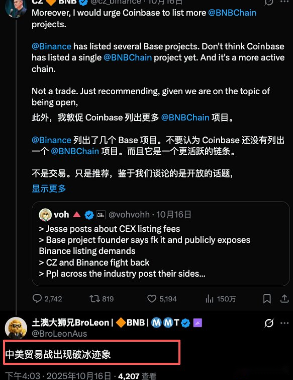 4日前、コインバスが$BNB上場を発表した後のCZ氏のツイートの下に、「米中貿易戦争に氷が解ける兆しがある」と書いた。