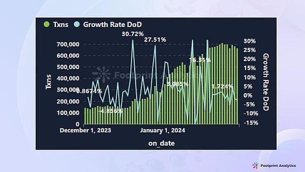 1 月,Ronin 的交易量和活跃用户数急剧增长,与 12 月相比,交易量激增了 213.41%。这一增长得益于对平台的持续改进以及其生态系统的扩展。Ronin 的游戏钱包新增了对 Ethereum、Polygon 和 BNB Chain 等主流区块链的支持,本月也通过 Pixels 和 Apeiron 等项目的空投活动,活跃了平台的活动情况。