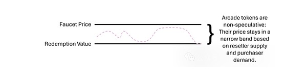 All of these non-speculative factors make arcade tokens particularly suitable as the basis for a controlled market economy.It’s important to note that this doesn’t depend on whether the use of Arcade Tokens is narrow (limited to a single app or service) or broader – they’re simply a result of the “faucet/redeem” design of Arcade Tokens.(Continuing with the arcade example: Even if the local grocery store owner is a video game enthusiast and chooses to accept tokens for local arcade games rather than cash payments, there is no reason to pay more than 25 cents per token if you can just walk up to the arcade and buy tokens for 25 cents.)