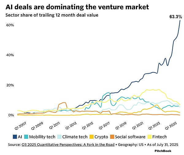 在风险投资的世界里,资金总是追逐回报率最高的方向。AI 的淘金热制造了一个前所未有的资本黑洞。根据 PitchBook 的数据,2024 年,全球约三分之一的风险投资流向 AI;到 2025 年上半年,这一比例在美国攀升至惊人的三分之二。