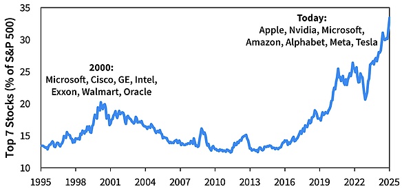 标普500指数在每个时间点前7只股票的总权重|图源:Sparkline
