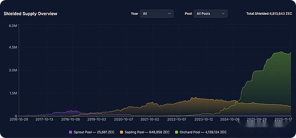 • Protected Shield Supply Grows: As previously mentioned, the amount of ZEC in protected shielded pools has grown significantly over the past year, which has helped improve the overall privacy of the network while acting as something of a “deflationary” pressure on the token supply.