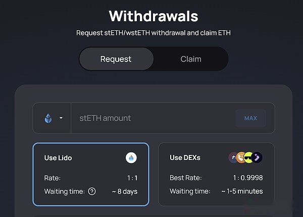 Durch Einsätze bei Lido (das 24 % der ETH-Zusagen kontrolliert) kann man beispielsweise stETH verdienen, ein fungibles Einlagenzertifikat, das sofort zu Marktpreisen eingelöst oder innerhalb weniger Tage im Verhältnis 1:1 gegen ETH eingelöst werden kann.Unabhängig davon, ob sie umtauschen oder einlösen, erhalten Inhaber von stETH aufgrund der höheren Liquidität und der größeren Validatorenbasis in der Regel eine bessere Ausführung als sonst – Faktoren, die die Börsenpreise erhöhen und Rücknahmen beschleunigen können.
